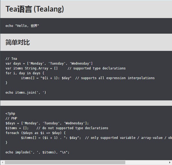 Tea语言采用强规范设计(规范即语法),拥有简约的强类型系统和单元模块体系,支持类型推断,支持面向对象和函数式编程,语法精炼简洁。其目标是成为一个友好的,支持多端开发的编程语言,并尽量支持常用编程语言生态,让开发者可以继续使用已有工作成果。目前通过编译生成PHP代码运行,可调用PHP库,可用于Web服务器端开发。预计后续将支持部分其它编程语言。