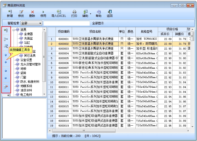 在商品信息窗口中上边是商品编辑工具条,左上角是商品类别,左下角是图片框,右边列表中是该类别对应的商品。需要先编辑类别,再编辑商品。