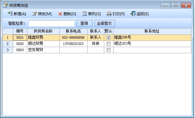 在“系统设置”模块中点击“供货商设置”按钮打开供货商信息窗口。在窗口中可以看到所有的供货商。点击“增加”按钮打开增加供货商窗口,输入供货商的信息,供货商名称不能重复。点击“修改”按钮可以修改选中的供货商信息。点击“删除”按钮可以删除选中的供货商。在“系统检索”框中,录入名称、拼音码、五笔码关键字,可筛选供货商,鼠标单击表列标题,可按升(降)排序。点击“全部显示”按钮可以列出所有的供货商信息。