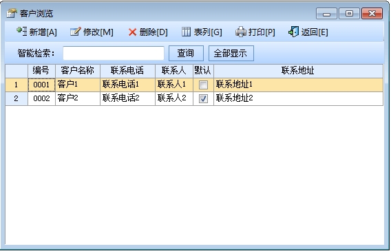 在“系统设置”模块中点击“客户设置”按钮打开客户信息窗口。在窗口中可以看到所有的客户。点击“增加”按钮打开增加客户窗口,输入客户的信息,客户名称不能重复。点击“修改”按钮可以修改选中的客户信息。点击“删除”按钮可以删除选中的客户。在“系统检索”框中,录入名称、拼音码、五笔码关键字,可筛选客户,鼠标单击表列标题,可按升(降)排序。点击“全部显示”按钮可以列出所有的客户信息。
