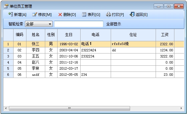 在“系统设置”模块中点击“单位员工设置”按钮打开员工信息窗口。在窗口中可以看到所有的员工。点击“增加”按钮打开增加员工窗口,输入员工的信息,员工名称不能重复。点击“修改”按钮可以修改选中的员工信息。点击"删除"按钮可以删除选中的员工。在“系统检索”框中,录入名称、拼音码、五笔码、助记词关键字,可筛选员工,鼠标单击表列标题,可按升(降)排序。点击“全部显示”按钮可以列出所有的员工信息。