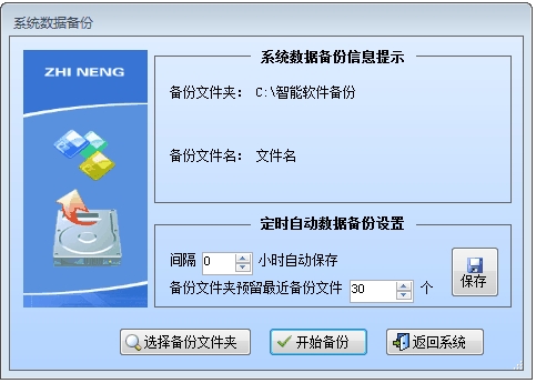 点击菜单“系统功能→数据备份”进入数据备份界面。先单击“选择备份文件夹”按钮,定位备份文件夹,再单击“开始备份”备份数据。备份文件名形如:XX20120809110304.ZIP,表示备份文件日期为2012年08月09日11时03分04秒。