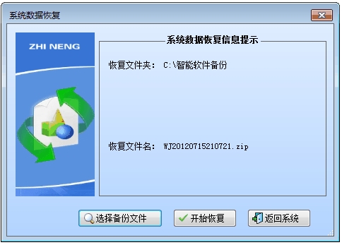 点击菜单“系统功能→数据恢复”进入数据恢复界面。先单击“选择备份文件”按钮,选择备份文件,再单击按钮“开始恢复”。