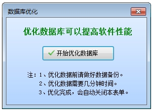 点击菜单"系统功能→数据库优化"进入界面,单击"开始优化数据库"按钮,系统开始自动优化数据,完毕退出本窗口。