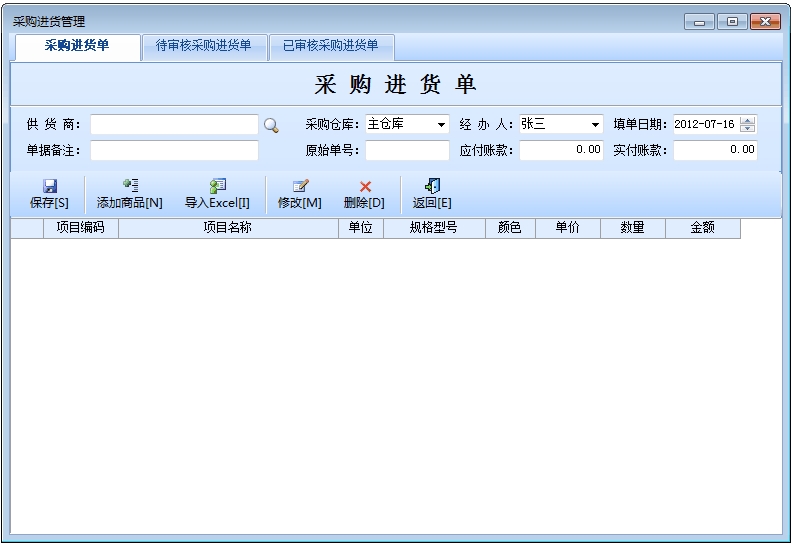 在“增加商品”窗口中分为两部分,左边的是商品信息,右边是已选商品。商品录入方法分为三种:1、在“商品清单”页面“智能检索”框中,录入编码、名称、拼音码、五笔码、条码关键字,系统自动筛选出相关商品,光标在“智能检索”框中,击上、下光标键、HOME键、END键定位商品,击回车键确认,击录入单价、数量后回车,即可录入商品。2、鼠标双击左边表格中的商品,然后录入单价、数量后,击回车键,即可录入商品。注:可先按1中方法筛选。3、在“商品列表”页面,先点树结构中的类别,系统自动筛选出该类型的商品,然后鼠标双击左边表格中的商品,录入商品。待商品录入完成后,单击“确定”按钮,回到主界面,再单击“保存”按钮把所选商品中的商品保存到采购进货窗口中。保存后,系统自动生成单据号:单据号由四部分组成如RK201208180001,前两位"RK"是采购进货单据的标志,"20120818"是2012年08月18号增加的单据,"0001"是流水帐号。系统提示:“未审核”单据只有"通过审核"后,才会使库存、账务信息发生变化;“已审核”单据不允许再修改,"未审核"单据允许修改;表格内红色文字表示欠款。