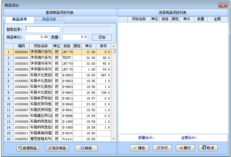 在窗口中选择供货商名称、采购仓库及经办人。点击“增加商品”按钮出现增加商品窗口: