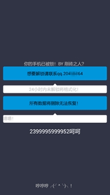 木马安装运行后,会迅速地把手机屏幕用自定义的对话框全部遮盖住,干扰用户正常使用手机,只有按照对话框的提示联系木马作者并付款,才能拿到解锁密码。