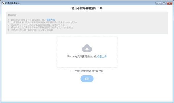 2、上传想要解包的文件,暂未支持多选,仅支持微信小程序包(wxapkg文件)