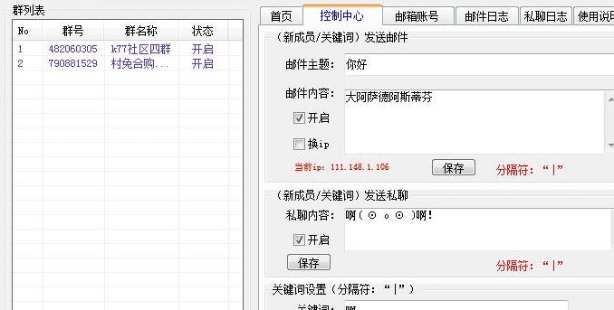多加一些群然后启动软件,当有新人加入群的时候,软件会自动对这个新加入的人发邮件(设置广告内容),进一个 发一封 进多少发多少,实时发送邮件,还可以设置 有人在群里聊天 就给他发邮件 从而达到引流的效果,可以想象一下,比如我加了500个2000人群 =1000000个人群 只有有人在群里聊天 或新进群的人 软件都能直接对他发送邮件 效果可想而知 软件永久免费使用