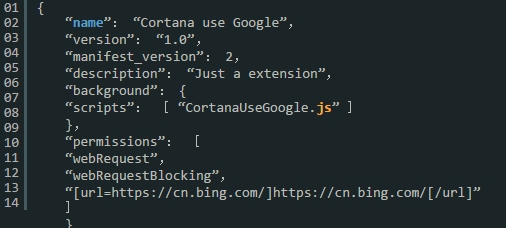 引擎修改:方法一:[网传这一种方法(不建议食用:非常多的人都在使用人反映不成功)]桌面新建名为CortanaUseGoogle的文件夹,在里面新建两个文档,重命名为CortanaUseGoogle.js和manifest.json用记事本打开后缀名js文件粘贴以下代码: