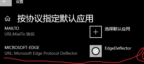 2、电脑菜单打开:设置——应用——默认应用——按协议指定默认应用——MICROSOFT-EDGE——选择安装后的EdgeDeflector。