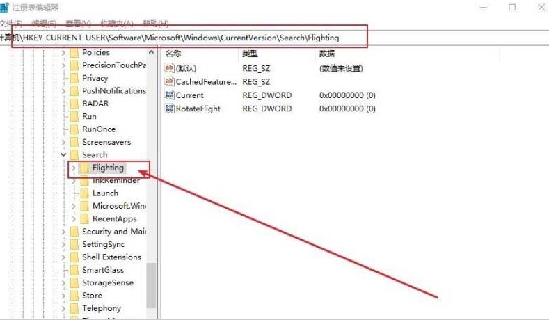 2、在其中找到,HKEY_CURRENT_USER⁄Software⁄Microsoft⁄Windows⁄CurrentVersion⁄Search⁄Flighting。
