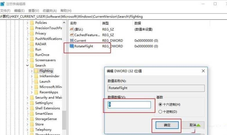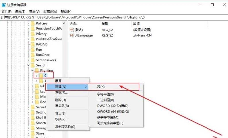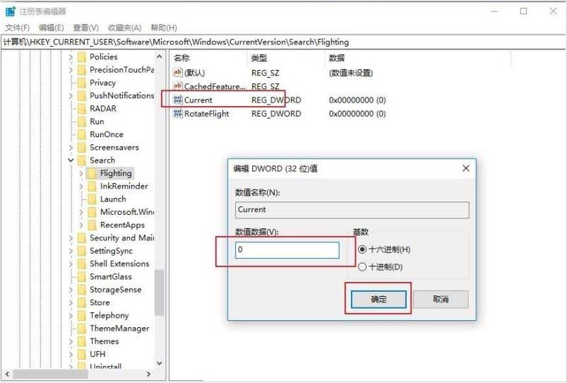 4、继续在注册表编辑器中找到,HKEY_CURRENT_USER⁄Software⁄Microsoft⁄Windows⁄CurrentVersion⁄Search⁄Flighting⁄0