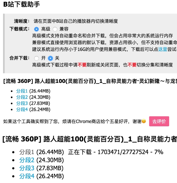 高级模式支持自动重命名和自动合并分段,会占用系统较大的运行内存,下载过程中不要刷新页面,否则只能重来。如果高级模式下载经常卡住,请尝试兼容模式