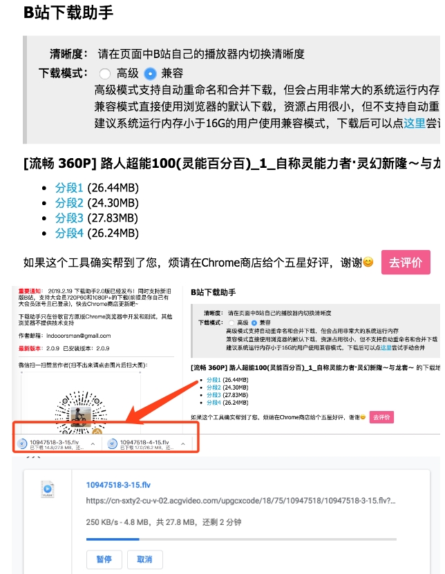 点击相应的分段链接即可直接调用浏览器的下载,兼容模式不怎么占用系统内存,但是不能合并分段,也不能自动重命名,开始下载后就可以关闭页面了