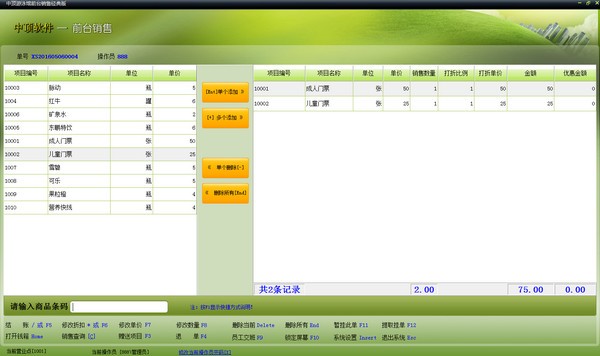 前台营业支持快速的门票销售,商品销售,支持退货,支持全键盘操作。