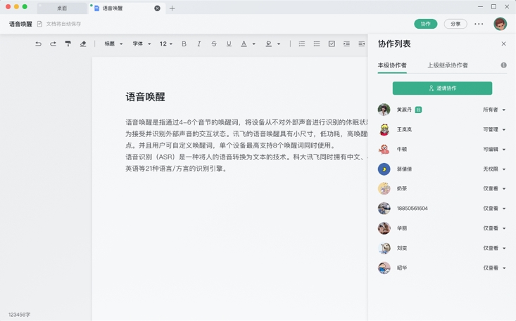 邀请协作者加入后,可同时协同一篇文档,内容变动实时查看。也可通过设置文件夹权限共享,高效同步团队资料。