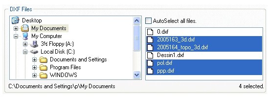 使用左侧窗口浏览您的磁盘。DXF文件出现在右侧窗口。您可以在点击时按住[Ctrl]键选择多个文件。如果您选择该选项,那么该目录中的所有DXF文件将被自动选择。