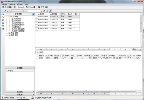 试剂管理系统差异版是针对试剂管理而专门设计的非常多的人都在使用人用的一款管理软件,适用于各类监督检验机构的检测中心,各研究机构的实验室等。 具体功能包括:基础设置(部门设置、员工信息、供商信息、生产商信息和试剂基本信息)、试剂管理(试剂登记、试剂出库、试剂明细库存、试剂种类库存、过期试剂、即将过期试剂和库存下限提醒)、购买计划表等全方位管理。本系统权限设置严格,录入人只能操作自己录入的数据,超级用户可以管理全部数据。