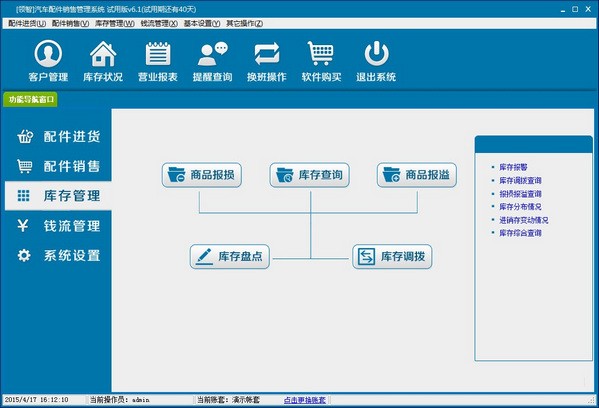 库存管理:商品报损、库存查询、商品报溢、库存盘点、库存调拨