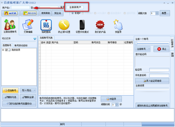 本软件是非常多的人都在使用人用的一款全自动的百度贴吧推广工具,包含帐号注册、帐号激活、发帖回帖文章采集、文章伪原创、关注喜欢贴吧、提升等级、发帖推广、回帖推广等等不同功能。自动换IP,可以使用ADSL模式,路由器换IP模式,操作简单。同时支持验证码识别,模拟手机贴吧,等等功能。