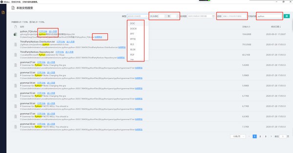 1、支持按照文档类型搜索,目前支持word、pdf、Excel、压缩文件、csv、wps、txt等。