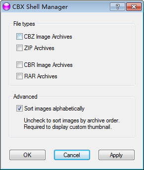 使用说明:先运行!)CBXShellPortable.exe或!)Install.bat完成初始化,然后执行主程序CBXManager.exe选择压缩格式即可,当前版本CBXShell。实际测试中CBXShell表现很好,如果无法预览的话,可能需要重建缩略图缓存,推荐使用作者的配套工具ThumbnailRefreshTool,不过它还不支持RAR固实压缩文件。
