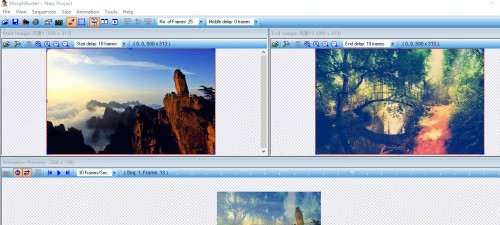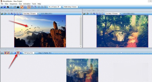 6、用"鼠标左键"在"Start Image"和"End Image"图片上"单击"进行描点,由这些描点构成图片切换的"变形"路径。再点击"Play/Stop Animation"按钮进行预览变形动画效果。