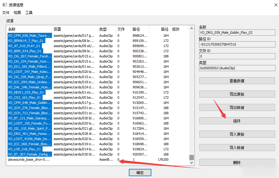 复制以后使用工具AssetBundleExtractor 打开刚复制的其中的一个文件。这里包含有多个炉石传说的不同版本的文件,所以我这里选择的是soundotherminion_base_zhcn-0文件base(基础) sound(音频)other(其他) minion(随从)简单来说这个文件应该是包含的是基础卡中其他类型(中立)的随从的音频文件而_zhcn应该是中文语音包的意思吧,