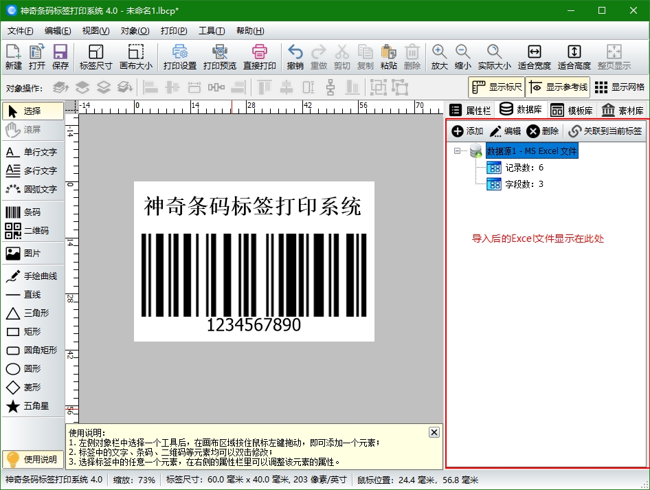 批量制作条码标签需要导入数据库,数据库包含Excel文件(电子表格)、Access数据库、SQLite数据库等,使用较多的是Excel文件,下面以Excel文件的使用为例演示如何使用数据库功能。