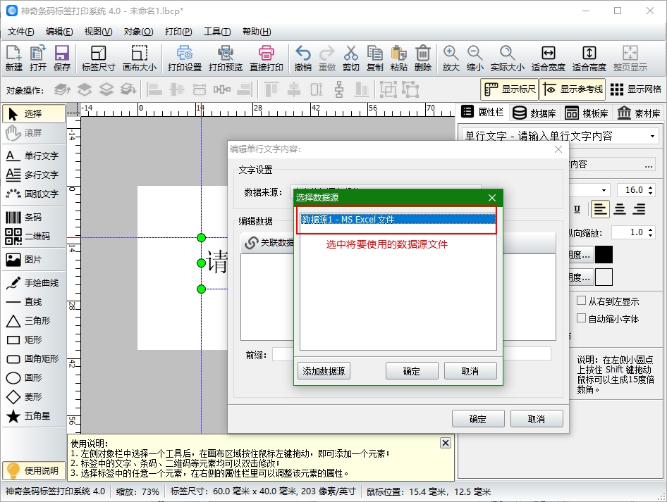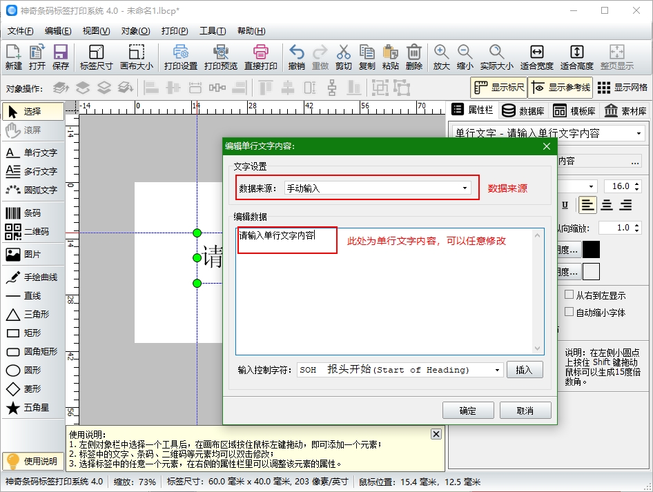数据库导入完成后,接下来创建标签内容,首先创建一个单行文字,单击左侧功能列表中的“单行文字”,将鼠标移动到软件中间的白色区域上面,点击鼠标左键,将会出现如下界面: