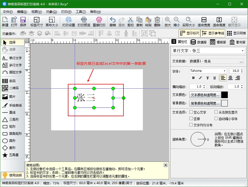 选择将要使用的数据源字段即可与当前标签元素进行关联,以姓名为例,选中姓名字段,点击确定,标签如下所示: