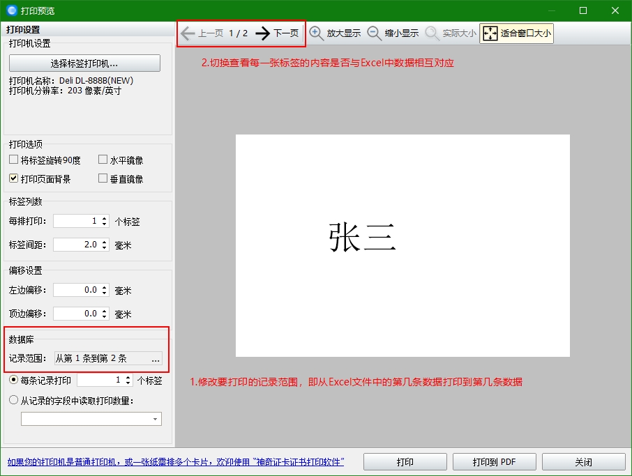 此时可以查看到生成的两个标签内容是不同的,每一个标签内容与Excel表格中的一条数据相对应,此时点击打印按钮即可实现标签的批量打印功能。