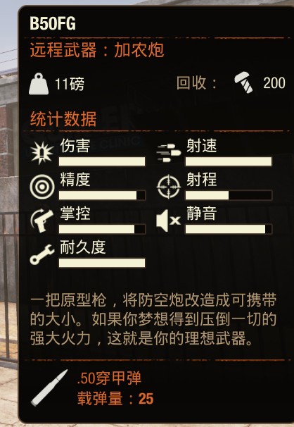 B50FG:游戏中的.50口径唯一个可以半自动和全自动开火的重狙了,无奈长相一般,瞄具特别小,枪身特别短,现在给它改变了瞄具,换成了高倍狙击镜、增加专业抑制器使枪身整体变长了些,这玩意只有神秘商人有卖,再没其他获得途径。