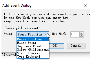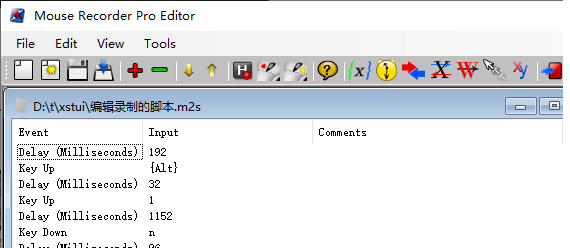 编辑录制的脚本编辑器支持手动添加各种事件,光标位置、鼠标事件、按键、延迟、启动进程、文本输入。编辑完成后使用Ctrl + T组合键或点击Transfer to MRP按钮返回到主界面。