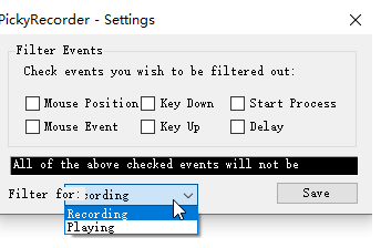添加事件如果不希望录制某些事件,可以通过菜单Tools - Plugins - Filter Events过滤掉。我们可以选择在录制或者播放时忽略选择的动作。