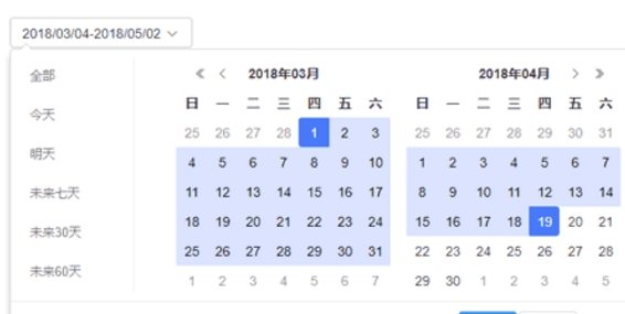 双日历插件daterangepicker为用户提供了双日历选择日期的功能时间段选择,把一个双日期选择格式修改成两个单日期格式的日期选择框,两个单日期格式分别为开始日期和结束日期,开始日期可选择范围在今天及今天之后,结束日期在开始日期之后,根据开始日期变化。