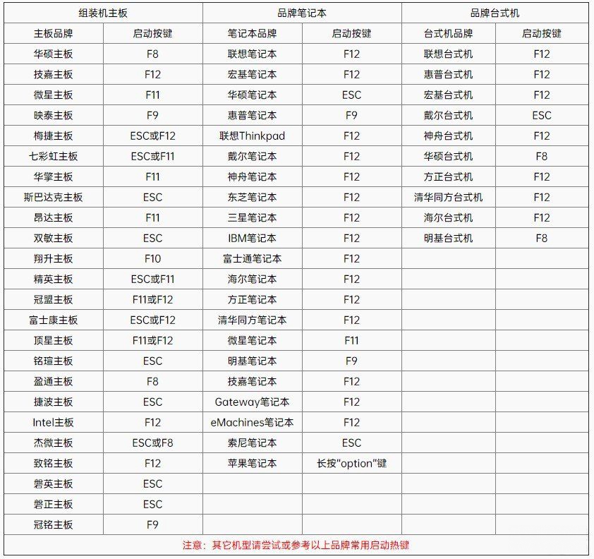 重启电脑后按主板图按相应按键进入系统启动项选择,主板选择按键如图示