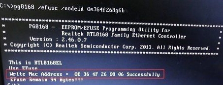 进入到这里之后,输入命令:pg8168 /efuse /nodeid 0E432B791B5E(以上命令格式为pg8168空格/efuse空格/nodeid空格xxxxxxxxxx)以上命令有空格的地方在输入的时候也需要打空格绿色的0E432B791B5E是什么意思呢这就是你的MAC地址,咱们需要修改的就是这串数字加字母的组合在修改中需要注意的是这串地址第二位必须是A.E.4这三个中的一个,其他都不可以,也就是说第二位就放A E 4其他的不行,例如:0E 95 5E 01 09 72完成之后,正确的画面应该是这样的,这就说明已经成功了