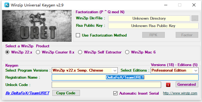 WinZip Universal Keygen是专门为WinZip系列打造的注册机四合一工具,可以快速生成注册码,帮助用户完美注册WinZIP的版本,是非常多的人都在使用人用的一款真正使用用户名、序列号注册的注册机精品!使用的时候需要首先进行原版WinZip程序的安装,适用winzip 22.x、winzip Courier 8.x、WinZip self Extractor、WinZIP Mac 6版本,并且同时支持32位64位运行环境。