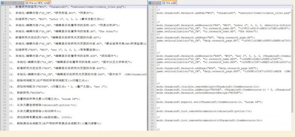 左边是经ZS Translator翻译后的内容,右边是用 Thaumcraft mot editor软件生成的魔改代码
