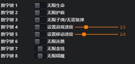 枪火重生修改器为喜爱这款游戏的玩家提供了多达8项的游戏参数修改功能,包括无限生命、无限护盾、无限子弹/无需装弹、设置游戏速度、设置移动速度、无限连跳、无限金钱、无限精魄,相信使用之后能给各位玩家带来前所未有的游戏体验,喜欢这款游戏的一定要试试哦!