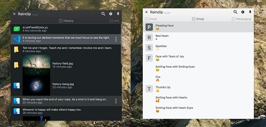 Rainclip剪贴板助手能够帮助用户保存复制的文本和图片的历史记录,其中图片既可以作为图片也可以作为文件粘贴,因此您可以轻松地将它们复制到文件系统中,您还可以保存你最常用的文本片段,随时随地粘贴到任何地方,此外该款软件在Mac和Windows上都能使用,支持在两个平台之间同步剪贴板内容,非常非常方便。