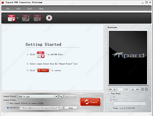 下载帮助:点击Tipard PDF Converter Platinum(PDF转换器)软件立即下载,解压后安装,一直点下一步,直到安装完成,再打开使用。