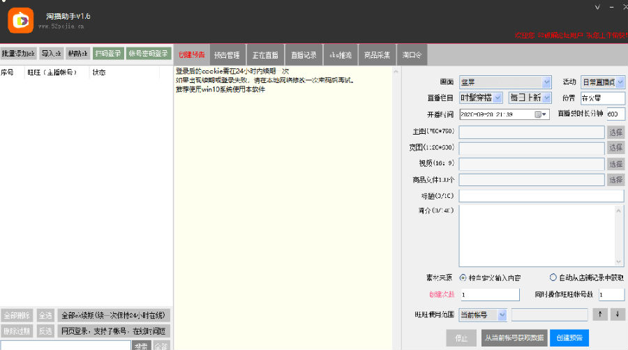 软件不错,友情和谐,已通过办法可以无限使用。论坛专版,略作贡献淘宝直播多帐号多任务管理工具,支持无限多帐号(可使用子帐号)同时操作,可快速发布预告,同时开播,商品上传,标记讲解,回放下载,无人直播,obs多推流无人直播,商品采集,淘口令生成和解析等,是主播必备的淘宝直播多开软件