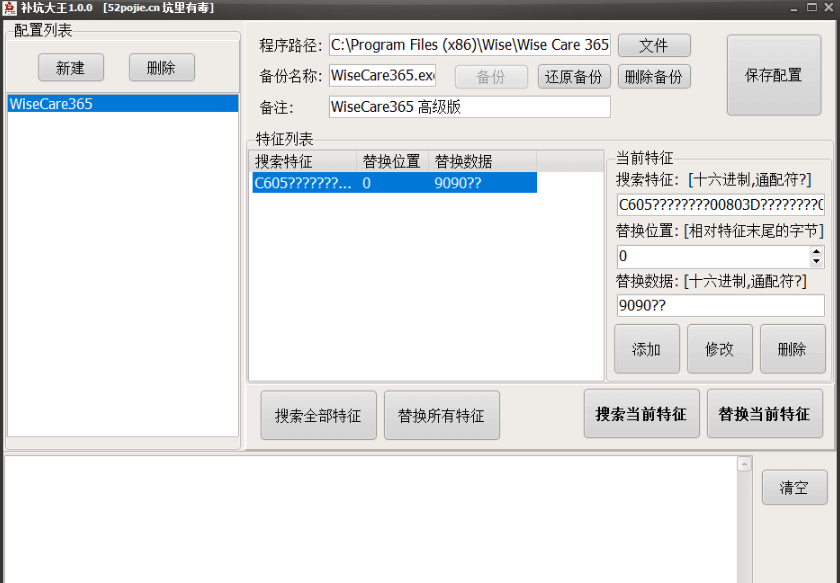 补坑大王提供于搜索特征码和替换特征码两种功能,能够帮助用户快速地修改补丁的特征码,或者用来测试特征码补丁,用010editor搜索特征码不支持通配符,这款软件没有限制,十六进制,支持通配符,支持空格,界面简洁直观,操作也很非常方便,满足用户的全部需求。