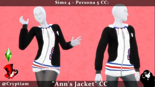 女神异闻录5中的Anne大家知道不,是个非常漂亮的女孩女生,本次带来的这款模拟人生4女神异闻录5外套MOD就是由玩家模仿Anne主外套/ Hoodie制作的一件衣服,效果如下图,非常清纯,活力满满,给人一种青春洋溢的高中生的感觉,大家感觉好看吗,好看的话就下载进游戏穿上吧~