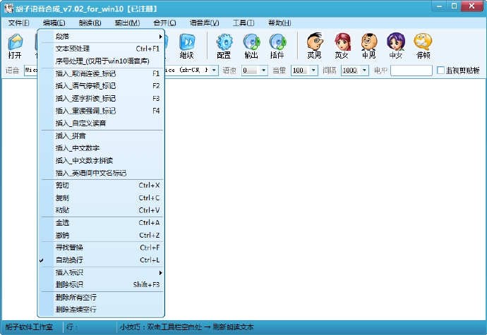 3、软件提供了四种角色:英文男声、英文女声、中文男声、中文女声(当然前提是您已经安装的相应的语音库),默认标识符为“英男 ”、“英女 ”、“中男 ”、“中女 ”,你可以很非常方便地通过工具栏按钮、右键菜单、快捷键等三种方式中的任何一种,将标识符插入到文本中,这样就可以实现中英文、男女声对话。