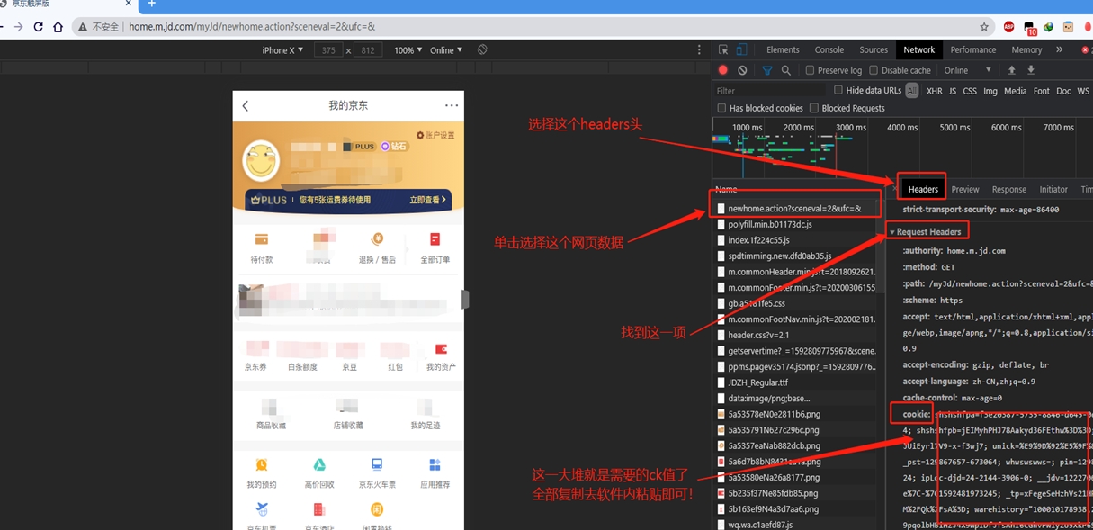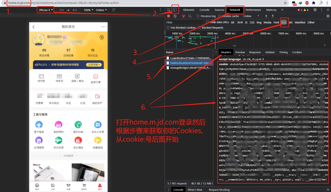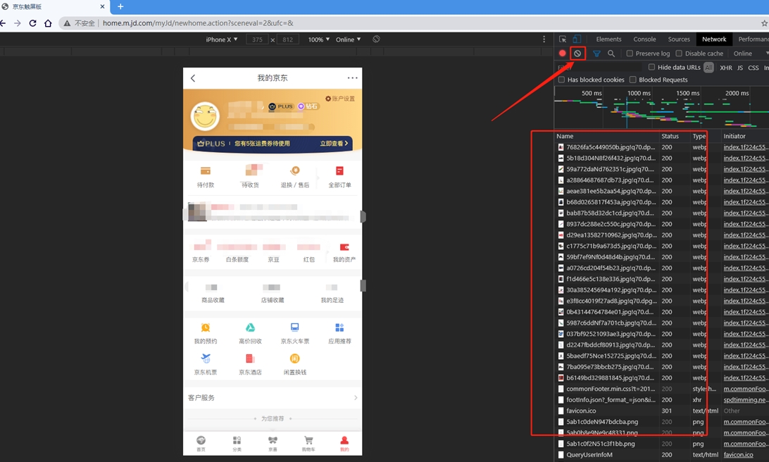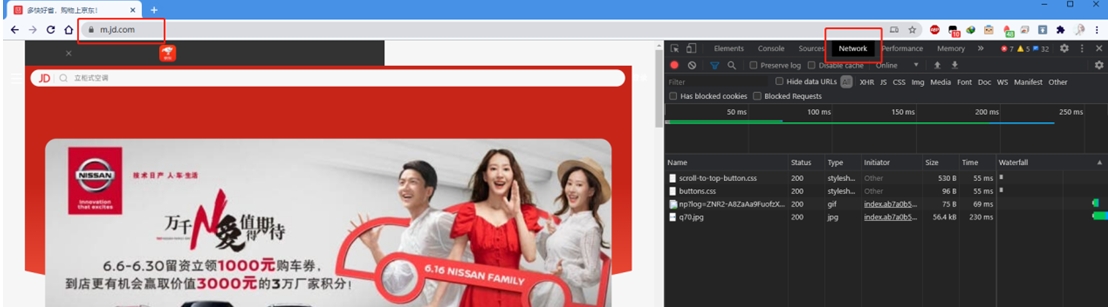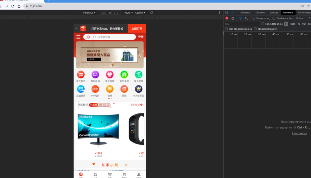 2. 地址栏输入 https://m.jd.com/ 然后回车 接着按下F12打开 开发者工具--点击network