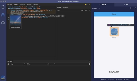 小程序开发者工具也提供了定制的 Devtool,用于查看模拟器运行的日志等。我们也提供了 AXML 插件用于调试小程序的元素: